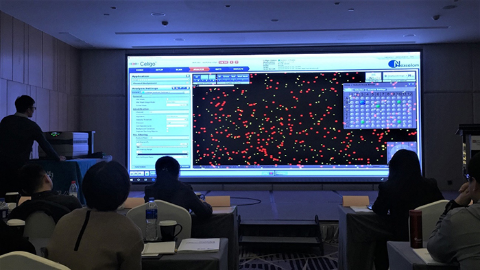 在Nexcelom中國區應用科學家孫明偉博士操控下,Celigo應用界面在超大的電子屏前一展風采。其快速高效的掃描和分析能力躍然眼前!