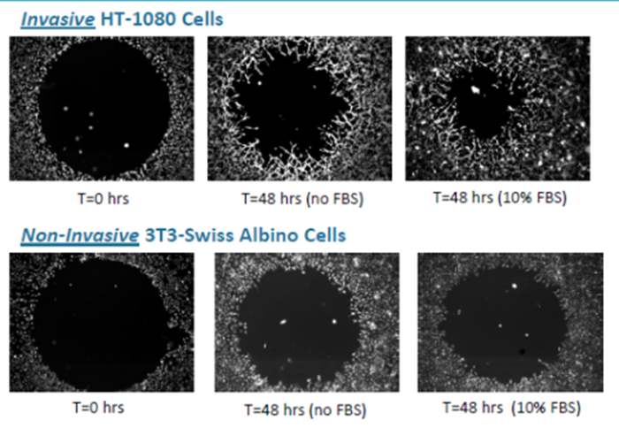 Platypus公司提供了遷移/侵襲新思路,利用間隙封閉法來實現(xiàn)最接近體內狀態(tài)的細胞遷移和侵襲。不用再穿越物理性的膜(如Transwell),也避免了劃痕的不均一性,原理如下: