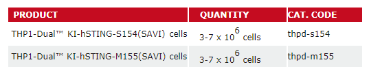 InvivoGen提供給一系列基于人源THP1單核細胞系的STING突變體的報告基因細胞株。其中,有兩款表達STING- associated vasculopathy with onset in infancy(SAVI)的功能獲得性突變體(S154 and M155)。SAVI患者在STING蛋白中顯示出單一突變,導致其持續激活和ISG的過度活化。S154是新生突變[1],M155是遺傳突變[2]。STING SAVI報告基因細胞株是篩選STING通路抑制劑便捷有力的工具。