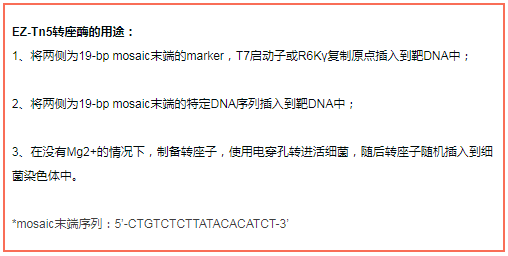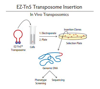 EZ-Tn5轉座子可在體外插入到含有靶DNA的載體。當EZ-Tn5轉座子在沒有鎂離子孵育時,形成穩定的EZ-Tn5轉座體復合體,可以被電擊進入活細胞,一旦進入細胞中,轉座體由細胞內鎂離子活化,就能隨機插入到宿主的基因組DNA中。