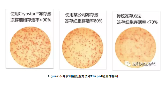 在 ELISPOT 檢測的應用中,往往需要用到凍存的淋巴細胞樣品作為檢測細胞。由于 ELISPOT檢測的是細胞的免疫功能,不僅僅需要保持細胞的存活率,而且還要保證細胞的功能不發生變化。傳統的細胞凍存方法通常是為了保存細胞株,對細胞存活率的要求不高,更沒考慮保持細胞原有的免疫狀態,所以傳統的細胞凍存方法已經不能滿足 ELISPOT 檢測的要求。