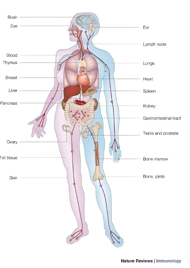 起初,T 細(xì)胞被認(rèn)為是免疫系統(tǒng)中 MIF 的主要細(xì)胞來源。然而,后來的文獻(xiàn)證明了單核細(xì)胞、巨噬細(xì)胞、血液中的樹突狀細(xì)胞、B 細(xì)胞、中性粒細(xì)胞、嗜酸性粒細(xì)胞、肥大細(xì)胞和嗜堿性粒細(xì)胞均表達(dá)MIF。值得注意的是,MIF 也由與宿主自然環(huán)境直接接觸的細(xì)胞和組織表達(dá),例如肺、皮膚上皮層以及胃腸道和泌尿生殖道。其另一個顯著特征是在內(nèi)分泌系統(tǒng)的幾個組織中高水平表達(dá),尤其是參與應(yīng)激反應(yīng)的器官(下丘腦、垂體和腎上腺)。