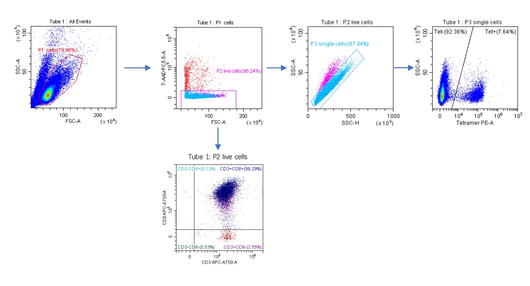 5、使用流式細胞儀對細胞進行分析,基于DAPI對活細胞圈門,并對“CD8+ pMHC -四聚體+細胞”進行分類;
