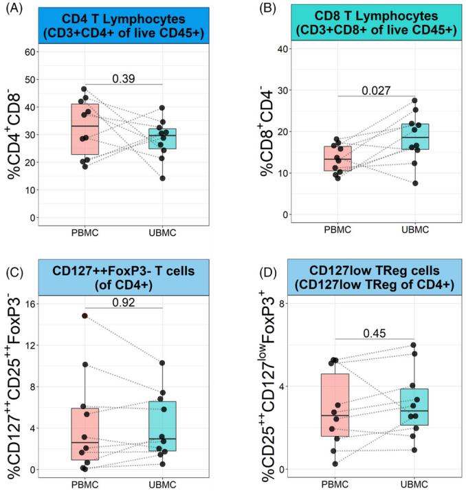 胎盤床和外周血CD45+白細胞CD4+ T淋巴細胞的平均百分比相似(圖7A)。然而,與外周血樣本相比,胎盤床中CD8+ T細胞的比更高(圖7B)。