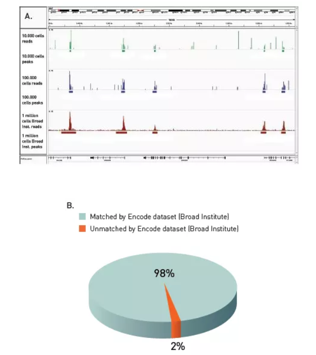A、用Diagenode的H3K4me3抗體、True MicroChIP Kit進行ChIP實驗,10000個細胞中ChIP下來17pg DNA,對照組35pg DNA。IP下來的DNA用MicroPlex Library Preparation Kit擴增并被轉化為可用于Illumina?平臺測序的文庫,通過IlluminaR Genome Analyzer分析文庫,根據說明書進行簇生成和測序。