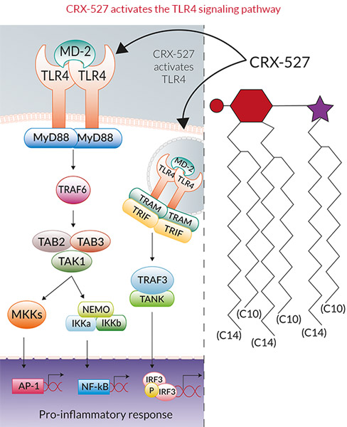 CRX-527屬于AGP(aminoakylglucoaminide 4-phosphate)家族,是一種合成的脂質(zhì)A類似物,可以激活Toll樣受體4(TLR4),進(jìn)而啟動MyD88和TRIF依賴的促炎信號級聯(lián)反應(yīng)。重要的是,CRX-527無需TLR4輔助受體CD14即可激活TRIF介導(dǎo)的Ⅰ型干擾素信號通路。 CRX-527與其他AGPs一樣,毒性低于LPS,并且重要的是保留了它的免疫刺激特性。作為未來的疫苗佐劑和單獨(dú)的免疫刺激劑,AGPs具有巨大潛力。